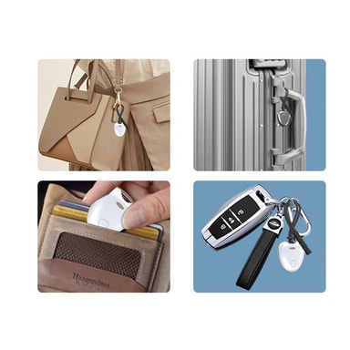 Kompakti ja monipuolinen: Tyylikäs ja kompakti muotoilunsa ansiosta tämä seurantalaite kiinnittyy vaivattomasti erilaisiin esineisiin, kuten avaimiin, laukkuihin, lompakoihin ja muihin, mikä varmistaa, että pysyt kirjassa tärkeistä tavaroistasi ilman massaa.