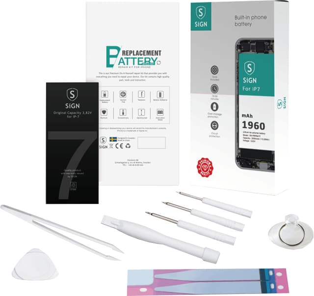 The SiGN -akunvaihtopakkaus sisältää kaiken, mitä tarvitset iPhone 7 -puhelimesi akun vaihtamiseen. Pakkaukseen sisältyy kolmannen osapuolen valmistama uusi akku, kiinnitysteippi, kaikki tarvittavat työkalut ja helppolukuinen ohje. Akun kapasiteetti on sama kuin puhelimen alkuperäisessä akussa ja se on suojattu ylilataukselta ja oikosululta.