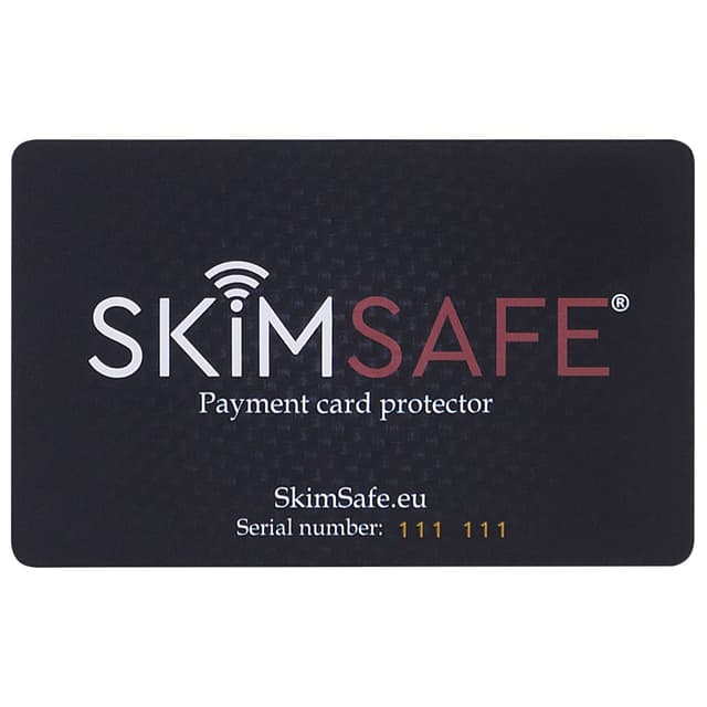 SkimSafe-suoja suojelee lähimaksukorttiasi luvattomalta kortin luvulta sekä mahdollisilta varkauksilta. Lähimaksukortti voidaan lukea luvattomasti noin 1 metrin päästä. Suoja on tavallisen maksukortin kokoinen ja se suojaa kaikkia lompakossasi olevia kortteja ja sotkee lukusignaalit jopa 3 metrin päästä. SkimSafe ei tarvitse akkua tai paristoja ja sen käyttöikä on 5 vuotta. Suoja ei vaurioita tai häiritse maksukorttien magneettiriatoja tai älypuhelimen toimintaa. SkimSafe on yksinkertainen tapa suojata maksukorttejasi.