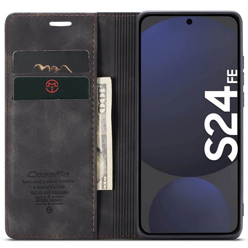 CaseMe Flip lompakko, yhteensopiva Samsung Galaxy S24 FE kanssa, on käytännöllinen kotelo ja tyylin ja eleganssin symboli. Useiden korttipaikkojen ja erillisen setelitaskun ansiosta voit helposti säilyttää tärkeimmät korttisi ja käteisen/kuitit. Piilotettu magneettilukko varmistaa, että kaikki pysyy paikoillaan ja suojaa puhelintasi naarmuilta, pudotuksilta ja iskuilta.