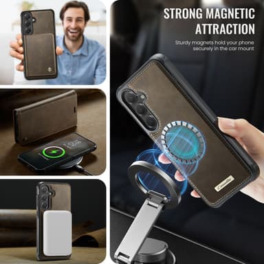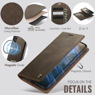 Tämä tyylikäs puhelinkotelo yhdistää käytännöllisyyden ja muotoilun. Se on valmistettu kestävästä TPU:sta ja PU-nahasta, tarjoten mukavan otteen ja luotettavan suojan iskuilta ja pudotuksilta. Pehmeä mikrokuituvuori suojaa puhelinta naarmuilta ja kulumiselta. Kotelo tukee täysin MagSafe- ja langatonta latausta, joten voit ladata puhelimesi helposti ilman kotelon poistamista. Magneettinen, irrotettava lompakkorakenne sisältää kolme korttipaikkaa ja setelitaskun, joten voit kuljettaa henkilökortit, luottokortit ja käteisen kätevästi. RFID-suojaus estää luvattoman skannauksen ja suojaa henkilökohtaisia tietojasi. Monitoimiteline mahdollistaa handsfree-katselun videoille, lukemiselle tai videopuheluille.