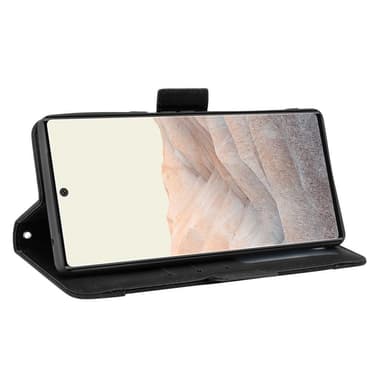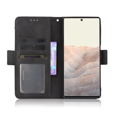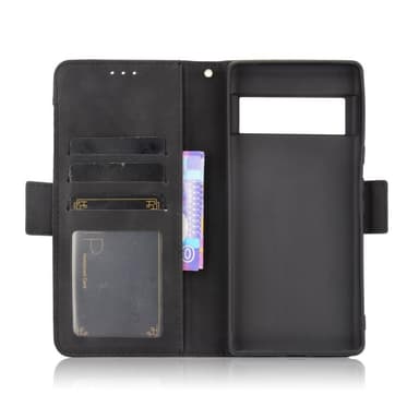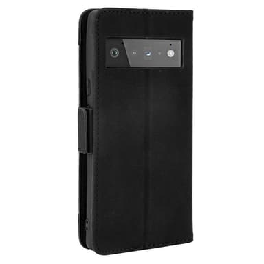 Lompak kotelineen muotoiltu puhelinkotelo, jossa on useita korttipaikkoja Google Pixel 6:lle - Musta lompakko erilliset paikat luottokorttien ja käteisen pitämiseen Tukiteline handsfree-kokemukseen Magneettinen lukko kotelon sulkemiseen Suojaa puheliTutustu ominaisuuksiin