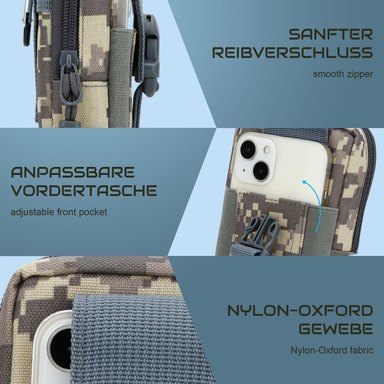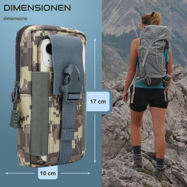 Cadorabon taktinen matkapuhelinkassi maastokuvassa sopii erinomaisesti ulkoilijoille. Se on 185 mm korkea ja 125 mm leveä, ja siinä on tilaa jopa 6,7 tuuman älypuhelimille. Se on ihanteellinen patikointiin, retkeilyyn, lenkkeilyyn ja muihin ulkoilma-aktiviteetteihin, ja se pitää tärkeät tavarasi turvassa ja käden ulottuvilla.