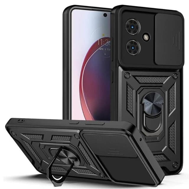 Tämä tyylikäs puhelinkotelo tarjoaa täydellisen tasapainon tyylin ja suojan välillä. Se on monipuolinen kotelo, joka on suunniteltu pitämään puhelimesi hyvin suojattuna samalla säilyttäen sen toiminnallisuuden ja antaen modernin ulkonäön. Ergonominen muotoilu varmistaa, että kotelo tuntuu luonnolliselta kädessäsi, jotta voit käyttää puhelintasi turvallisesti kompromisoimatta mukavuutta. Koteloa on huolellisesti suunniteltu varmistamaan pääsy puhelimen painikkeisiin ja toimintoihin. Puhelinkotelo on varustettu sisäänrakennetulla taittuvalla tuelle, joka on suunniteltu tarjoamaan optimaalisen handsfree-kokemuksen. Koteloissa on monipuolinen rengastuki takana, joka toimii myös selfie-renkaana. Tämä nerokas ominaisuus mahdollistaa puhelimen pitämisen turvallisesti selfieiden aikana, mikä antaa lisää vakautta ja hallintaa. Lisäksi puhelinkotelo on varustettu liukuvalla luukkutoiminnolla, joka suojaa kameraa naarmuilta ja roskilta. Helppo liukumekanismi nopeaa pääsyä varten kameraan.
