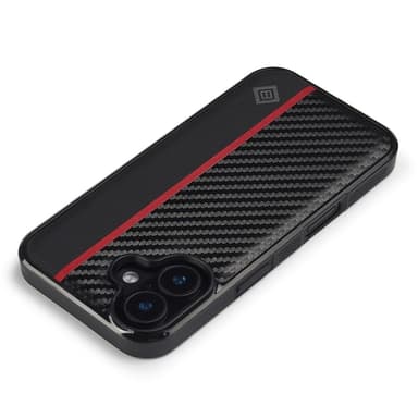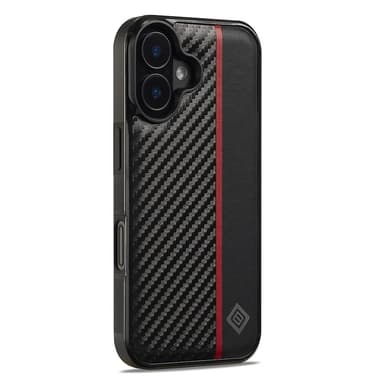 TPU + EVA 2-in-1 hybridi pohjakotelo, kestävä ja naarmuuntumaton. Hiilikuituteksturoitu pinta ja PU-nahkapäällyste, jossa punainen pystysuora raita, tyylikäs ulkonäkö. Alumiiniseoslogolla korostetaan korkeaa laatua.