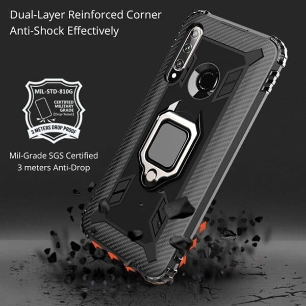 Iskua vaimentava suojakuori Huawei Honor 10i / 20i sisäänrakennetulla rengaspidikkeellä / jalustalla. Ohut ja kätevä matkapuhelimen kuori tyylikästä Carbon Fiber-muotoilua, joka tarjoaa puhelimesta tukevan otteen ja suojaa sitä lialta, pölyltä, naarmuilta, iskuilta ja arjen kulumiselta lisäämättä painoa tai olematta kömpelö. Kuoren tiukasti sulkeutuva istuvuus tarjoaa optimaalisen suojan jättäen täyden pääsyn kaikkiin puhelimen portteihin ja painikkeisiin. Kuoren takana olevaa käytännöllistä mobiilirengasta voidaan kääntää ja kiertää eri asentoihin käytettäväksi joko sormipidikkeenä, mikä tarjoaa tukevan otteen puhelimesta, tai jalustana elokuvien katseluun vaakasuorassa jne. Kaksinkertainen kulmien vahvistus tarjoaa ylimääräisen suojan iskuilta ja pudotuksilta.