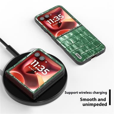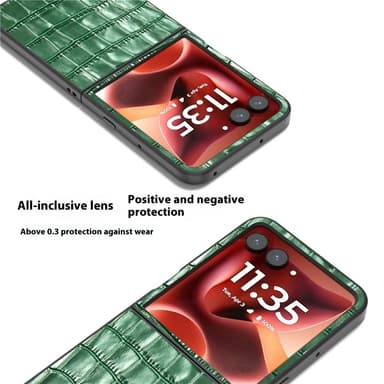 Tämä tyylikäs puhelinkotelo on valmistettu aidosta lehmännahasta ja PC-materiaalista, tarjoten ylellisen tuntuman ja suojan päivittäistä kulutusta vastaan. Krokotiilikuvioitu lehmännahkapinta yhdistää kestävyyden ja tyylin, tehden kotelosta täydellisen valinnan erottuvaan ilmeeseen. Korotetut reunat kameran ja näytön ympärillä suojaavat naarmuilta ja iskuilta. Tarkat leikkaukset takaavat helpon pääsyn kaikkiin portteihin ja toimintoihin. Kotelon langaton lataustuki lisää käyttömukavuutta.