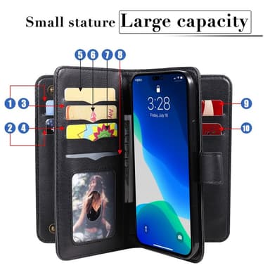 PU-nahkainen lompakkokotelo modernilla muotoilulla, jossa on yhteensä 10 lokeroa.9 lokeroa korteille1 lokero henkilöllisyystodistukselle/valokuvalle1 suurempi lokero seteleille tai kuiteilleTPU sisäkuoriMagneettilukkoSopii: iPhone 14 Pro MaxTutustu ominaisuuksiin