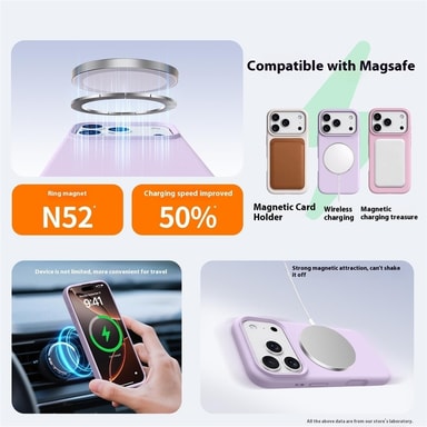 Tämä ohut silikonikuori yhdistää tyylikkään muotoilun ja käytännöllisen toiminnallisuuden. Sisäänrakennettujen vahvojen magneettien ansiosta se on täysin yhteensopiva MagSafe-latauksen kanssa, mikä tekee langattomasta latauksesta sujuvaa ja tehokasta ilman, että kuorta tarvitsee poistaa. Korkealaatuinen, pehmeä nestemäinen silikoni tuntuu miellyttävältä ihoa vasten ja tarjoaa varman otteen, kun taas iskunvaimentava PC-kerros suojaa puhelinta kolhuilta. Pehmeä kuituvuori suojaa naarmuilta ja vaimentaa iskuja. Kuori on lisäksi öljyn-, lian- ja sormenjälkienkestävä, mikä pitää puhelimesi puhtaana. Suuri kameraleikkaus suojaa kameraa häiritsemättä kuvaamista.