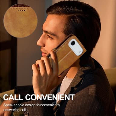 Tämä tyylikäs kotelo on valmistettu PU-nahasta, jossa on vasikannahkainen rakenne, sekä TPU-materiaalista, tarjoten pehmeän tuntuman ja hienostuneen ulkonäön. Se suojaa puhelinta kauttaaltaan 360 asteen suojalla. Kaksi korttipaikkaa, valokuvapaikka ja setelitasku mahdollistavat lompakon jättämisen kotiin. Taitettava jalusta mahdollistaa säädettävän katselukulman handsfree-käyttöön. Vahva magneettisuljin pitää puhelimen, rahat ja kortit turvassa. Varattu kaiutinaukko mahdollistaa puhumisen kotelo suljettuna.