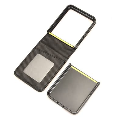 Tämä korttikotelo on valmistettu hiilikuitutekstuurisesta PU-nahasta ja PC-materiaalista, tarjoten miellyttävän tuntuman kädessä. Korttipaikat helpottavat tärkeimpien korttien säilytystä. Tarkat leikkaukset takaavat helpon pääsyn kaikkiin portteihin ja toimintoihin. Kotelon suojaava rakenne peittää puhelimen kokonaan ja suojaa sitä arjen kolhuilta ja vaurioilta. Integroitu taitettava muotoilu tekee käytöstä vaivatonta.