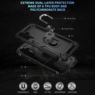 Iskunkestävä Armor-kuori, jossa on tyylikäs ulkoasu ja rengas takana paremman pidon takaamiseksi.