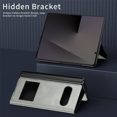 Tyylikäs kotelo, valmistettu nappapintaisesta PU-nahasta ja PC-sisäkuoresta, tarjoaa kestävän ja pehmeän tuntuman. Etukannessa on läpinäkyvä ikkuna, josta näet kellonajan, puhelut ja ilmoitukset yhdellä silmäyksellä. Magneettisuljin pitää kannen tiukasti kiinni ja estää tahattomat avautumiset. Sisäänrakennettu jalusta mahdollistaa mukavan katselun videoille, lukemiselle tai videopuheluille ilman käsiä. Kotelon suojaus estää naarmut, sormenjäljet ja arjen kulumat, ja kaikki portit ja painikkeet ovat helposti käytettävissä.