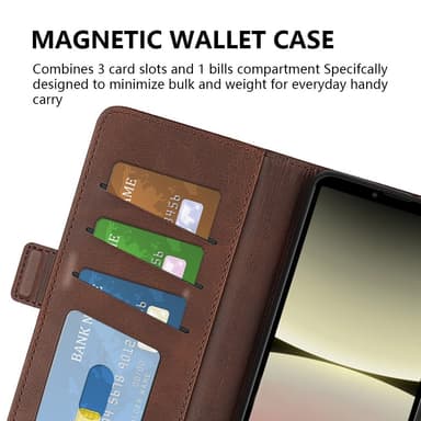 Lompakkokotelo premium PU-nahkaa, jossa on yhteensä 4 lokeroa.2 korttipaikkaa sisäpuolellaYksi lokero henkilöllisyystodistukselle/valokuvalleTPU sisäkuoriPremium PU-nahkaYksi suurempi lokero muistiinpanoja tai kuitteja vartenErittäin ohut magneettiluTutustu ominaisuuksiin