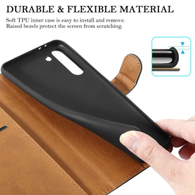 SUUNNITTELU: Kirjatyylinen tekonahkakotelo integroidulla kotelolla, joka tarjoaa matkapuhelimellesi täydellisen pidon. Läppä voidaan taittaa 360 astetta, joten se ei ole tiellä soitettaessa tai kirjoitettaessa.