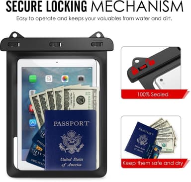 Laukku on tiivistetty hyvin ja suojaa laitettasi vedeltä, lumelta ja pölyltä samalla kun varmistat, että käytät tablettia/puhelinta toiminnallisesti. Täydellinen aurinkosuihkussa rannalla, sukellusuinnissa, lumisateessa ja muihin ulkovesiurheilulajeihin.