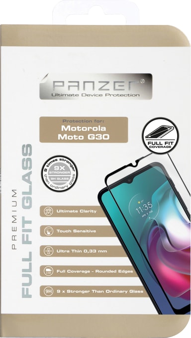 Panzer Full-Fit -näytönsuoja pitää Motorola Moto G20/G30/G50 -älypuhelimen näytön naarmuttomana ja kirkkaasti näkyvillä. Näytönsuoja on valmistettu silikaattilasista, joka on kestävintä markkinoilla olevaa lasia. Näytönsuojan reunat ovat kaarevat, jonka ansiosta se sulautuu helposti osaksi älypuhelinta. Näytönsuoja on vain 0,33 mm paksuinen, jonka ansiosta laitteen kosketusherkkyys pysyy muuttumattomana. Lisäksi sen kehykset on suunniteltu säilyttämään laitteen kaunis ulkoasu.