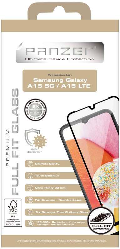 Suojaa puhelimesi Panzer Full-Fit Samsung Galaxy A15 5G/LTE -näytönsuojalla. Karkaistu lasisuojus on 0,33 mm paksu, kestää iskuja ja tiputuksia ja sisältää pirstoutumisenestokalvon, joka pitää sirpaleet yhdessä paikassa särkymisen sattuessa.Tutustu ominaisuuksiin