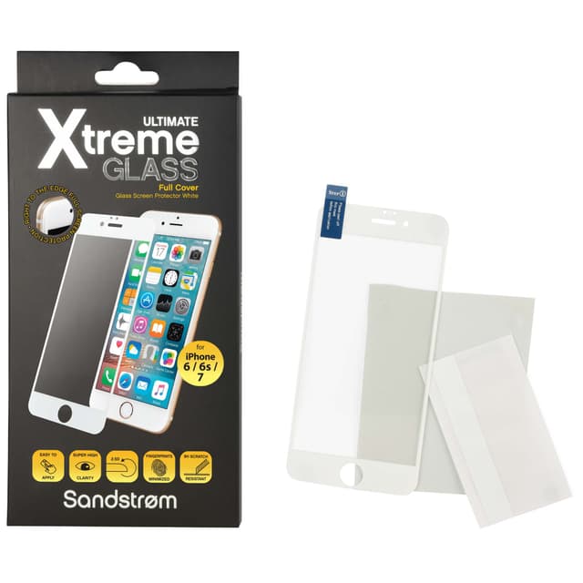 Ohut ja kestävä Sandstrøm Curved -lasi suojaa iPhone 6/6S/7 -älypuhelimesi näyttöä. Naarmuuntumattomasta ja erittäin kestävästä lasista (9H) valmistettu suoja peittää näytön täydellisesti ja sen kiinnittäminen on helppoa. Koko näytön peittävässä suojassa on valkoiset reunat.