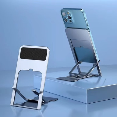 Taitettava muotoilu: Kun et käytä, taita jalusta tasaiseksi säästääksesi tilaa ja työnnä se laukkuun tai taskuun. Sen ohut profiili ja kevyt muotoilu tekevät siitä uskomattoman kannettavan ja helppo kuljettaa mukana.