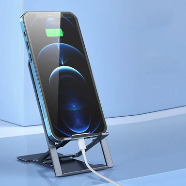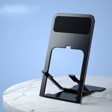 Taitettava muotoilu: Kun et käytä, taita jalusta tasaiseksi säästääksesi tilaa ja työnnä se laukkuun tai taskuun. Sen ohut profiili ja kevyt muotoilu tekevät siitä uskomattoman kannettavan ja helppo kuljettaa mukana.