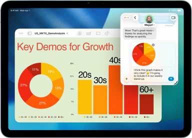 Siinä on upea Liquid Retina näyttö, vaikuttavat videopuhelut tarjoava 12 Mpix Center Stage -etukamera, iPadOS sekä huippunopea wifi 7 (2). Lisäksi se toimii mm. Apple Pencil Pron ja iPad Airin Magic Keyboardin kanssa, joten voit käyttää useita appeja samanaikaisesti, opiskella, tehdä töitä, pelata ja luoda vaivattomasti.