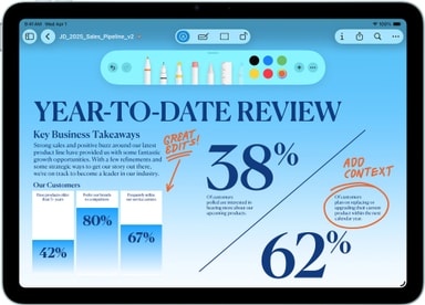 Siinä on upea Liquid Retina näyttö, vaikuttavat videopuhelut tarjoava 12 Mpix Center Stage -etukamera, iPadOS sekä huippunopea wifi 7 (2). Lisäksi se toimii mm. Apple Pencil Pron ja iPad Airin Magic Keyboardin kanssa, joten voit käyttää useita appeja samanaikaisesti, opiskella, tehdä töitä, pelata ja luoda vaivattomasti.