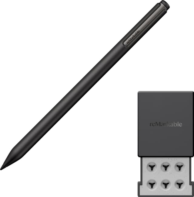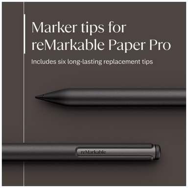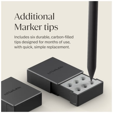 Täysin uusi Marker on suunniteltu pitkäikäiseksi, ja siinä on kuusi varakärkeä, jotka on sijoitettu kätevään Marker-kärkikoteloon, jotta niiden vaihtaminen on vaivatonta. Hiilitäytteiset kärjet on suunniteltu kestämään kaksi kertaa kauemmin kuin reMarkable 2 -kynässä käytetyt kärjet, mikä takaa, että kirjoituksesi pysyy terävänä ja tasaisena pitkään.