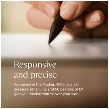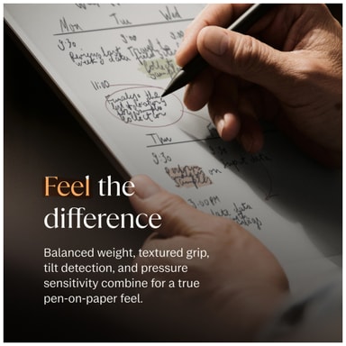 Marker Plus-kynän ergonomisesti kuvioitu pinta tarjoaa turvallisen otteen pitkiä kirjoitussessioita varten. Kynä on harkitusti painotettu, jotta se tuntuisi oikealta kynältä, ja tarjoaa mukavan otteen, jonka ansiosta voit työskennellä tuntikausia ilman epämukavuutta.