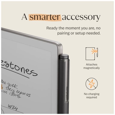 ReMarkable Paper Pro Marker Plus -stulyskynän avulla voit vapauttaa luovuutesi ja saavuttaa seuraavan tason tuottavuuden. Nauti edistyksellisestä muistiinpanojen laatimisesta ja luonnostelusta moitteettomalla tarkkuudella ja muunna käden liikkeet kauniiksi taideteoksiksi. Kynä kiinnittyy tablettiisi magneettisesti ja sen toiminta on paristovapaata (yhteensopiva vain reMarkable Paper Pro -tabletin kanssa - ei toimi muilla reMarkable-laitteilla).