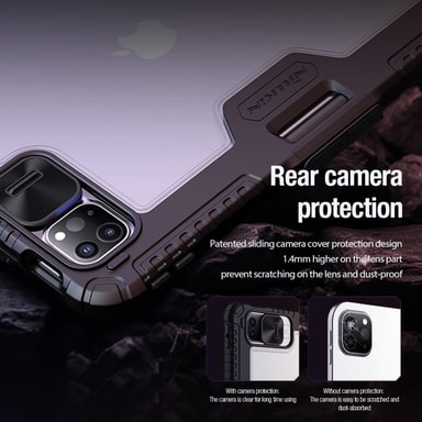 NILLKINin kotelo tabletillesi, joka suojaa hyvin kolhuilta ja putoamisilta. Lisäsuojareunat ja kameran liukusäädin takana.