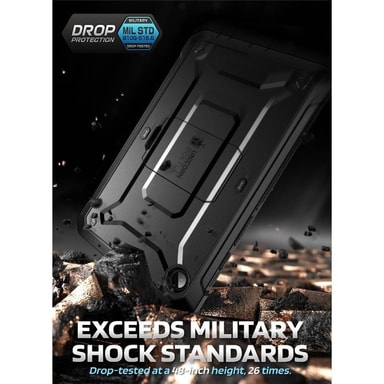 Supcase Unicorn Beetle Pro tablettikotelo on suunniteltu täyttämään korkeimmat standardit ja tarjoaa tabletillesi parhaan mahdollisen suojan. Polykarbonaattisella iskunvaimennusosalla ja TPU reunoilla sekä polykarbonaattisella etuosalla tämä tablettikotelo tarjoaa sotilasluokan suojaa naarmuilta, iskuilta ja putoamisilta. Supcase on voittanut CNET: n ensimmäisen palkinnon erilaisissa testeissä, joissa kotelon pudottaminen eri korkeuksista ei ole rikkonut sitä. Supcase on myös saanut Yhdysvaltain sotilasstandardin MIL-STD 810G-516.6 sertifikaatin. Tablettikotelossa on integroitu teline, joka voidaan taittaa tarvittaessa. Integroitu näytönsuoja pitää tabletin näytön suojattuna liialta lialta ja naarmuilta.
