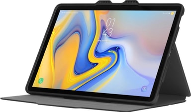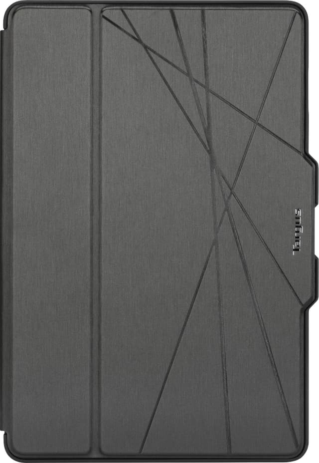 Targus Click-In -suojakotelon iskuja vaimentava runko on testattu MIL-STD-810G 516.6 -standardin mukaisilla testeillä, joten voit olla varma, että pienet pudotukset ja iskut eivät pääse vahingoittamaan tablettiasi. Helposti kiinnitettävä suojakotelo jättää tablettisi liittimet, kameran ja ohjaimet vapaiksi, mutta tämän lisäksi se on varustettu erityisillä kammioilla, jotka tehostavat ja kohdistavat kaiuttimista lähtevää ääntä. Kangaspehmusteilla varustettu kansi herättää ja asettaa tabletin unitilaan automaattisesti. Suojakotelo voidaan taittaa myös käteväksi telineeksi, jonka ansiosta esimerkiksi videoiden katselu käy mukavammin. Vahvan magneettisulun ansiosta kotelo ei pääse vahingossa aukeamaan.