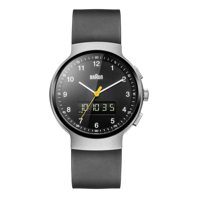 Tämä klassinen Ana-Digi -kello on ensimmäinen Braun-kokoelmassa yhdistää analogisen kellon klassiset elementit digitaalisen kellon toiminnallisiin näkökohtiin. Digitaalisen digitaalisen kellon digitaalifunktioihin kuuluvat: kaksoisaika, päivä, päivämäärä, hälytys, kronografi ja EL-taustavalo. Saatavana musta kumi hihna, joka on erityisesti suunniteltu mukavuutta.
