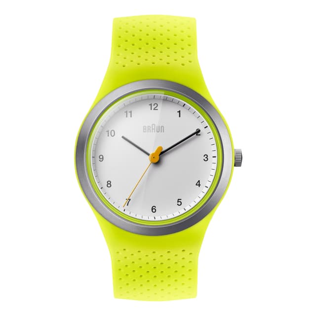 Braunin miesten parhaiten myyvien Braun-urheilulajien perusteella Ladies Sportsin suunnittelun ominaisuudet ja materiaalit ovat totta Braunin ydinperiaatteisiin. Nyt saatavilla ainutlaatuisessa neonparrussa tai keltaisena, nämä värit ovat tulosta laajasta Braun-värinmuodostusprosessista. Kestävä silikonihihna on suunniteltu erittäin mukavaksi.