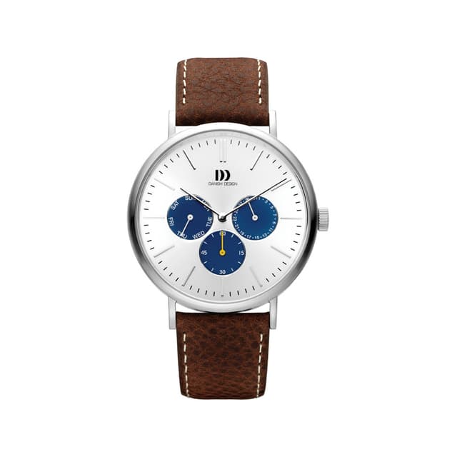 Tämä monitoimikello danish design antaa täydellisen päivityksen. Siinä on ruostumattomasta teräksestä valmistettu kotelo, jossa on valkoinen valitsin ja sininen monitoimilaite, mineraalilasi ja ruskea nahkahihna.