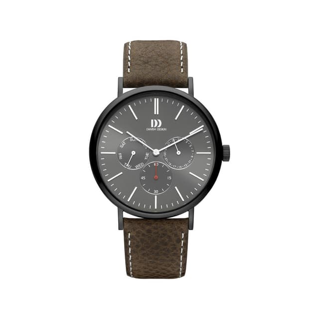 Tämä monitoimikello danish design antaa täydellisen päivityksen. Siinä on ruostumattomasta teräksestä valmistettu kotelo, jossa on harmaa valitsin ja monitoimilaitteet, mineraalilasi ja ruskea nahkahihna.