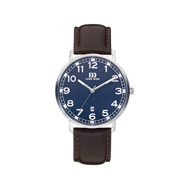 Danish design-kellolla on ruostumattomasta teräksestä valmistettu kotelo, jossa on sininen valitsin, jossa on valkoiset timemarkerit, päivämääränäyttö, mineraalilasi ja ruskea nahkahihna.