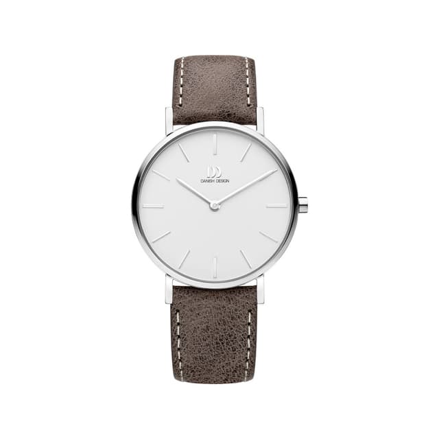 Tämä danish design-kello ei ole pelkästään yksinkertainen, vaan kaunis myös hihnan pienet yksityiskohdat. Kellossa on ruostumattomasta teräksestä valmistettu kotelo, jossa on valkoinen valitsin, mineraalilasi ja ruskea nahkahihna, jossa on valkoiset ompeleet.