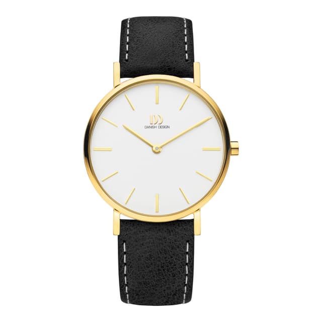 Täydellinen ottelu kaikille asuille ja päiville. Danish design-kello sisältää kullanvärisen ruostumattomasta teräksestä valmistetun kotelon, jossa on valkoinen valintakiekko, mineraalikristalli ja musta nahkahihna. Kotelon koko: 34mm. Vedenkestävyys: 3 atm.