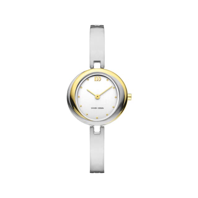 Yksinkertaisesti vain kaunis design-kello danish design. Kellossa on ruostumattomasta teräksestä valmistettu kotelo, jossa on valkoinen valkokangas, kultainen väri, mineraalilasi ja ruostumattomasta teräksestä valmistettu rannekoru.