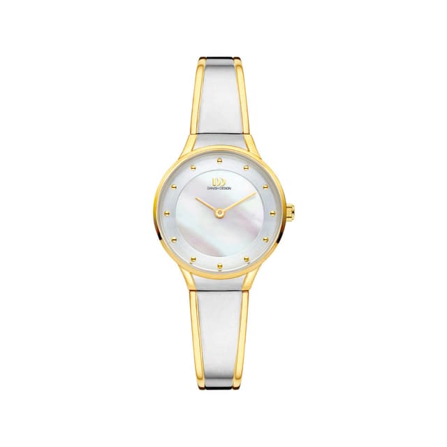 Yksinkertainen ja klassinen kello, jossa naisellinen kosketus on vain danish design. Kellossa on ruostumattomasta teräksestä valmistettu kotelo, jossa on valkoinen helmiäisvalokehys, kullanväriset yksityiskohdat, mineraalilasi ja ruostumattomasta teräksestä valmistettu rannekoru.