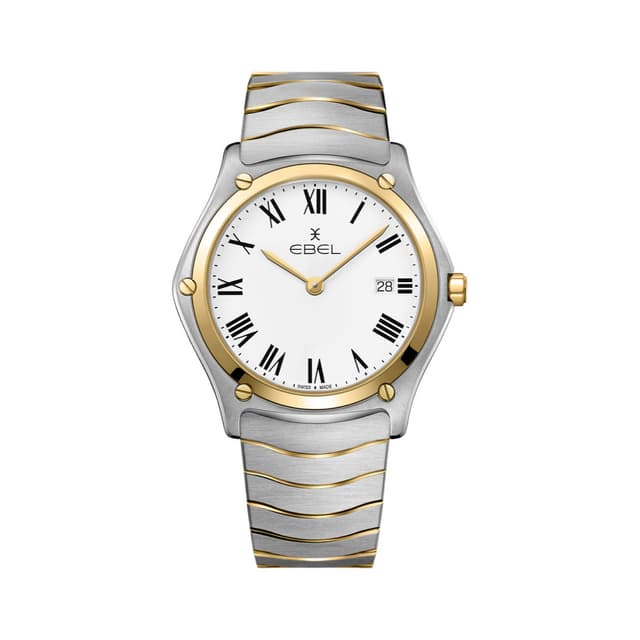 Miesten ebel sport classic, ruostumaton teräs ja 18 k keltainen kullakotelo, ø 40,0 mm, valkoinen soittaa mustalla mustavalkoisella numerolla, safiiri-kristalli, jossa on anti-peilikäsittely. Solki, sveitsiläinen kvartsiliike, vedenpitävä jopa 50 metriin asti.