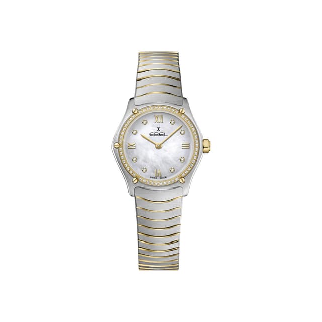 Naisten ebel sport classic mini, ruostumaton teräs ja 18 k keltainen kullakotelo, jossa on 53 timanttia (0.1643 ct), ø 24,0 mm, valkoinen helmi-valintakiekko, jossa on käytetty roomalaisia numeroita ja 8 timanttia (0,052 ct), safiirikristallia, jossa on anti-peilikäsittely. , kaksisävyinen ruostumattomasta teräksestä valmistetun aaltolinkin rannekoru, jossa on valittavissa koruja lukko tai käyttöönotto solki.