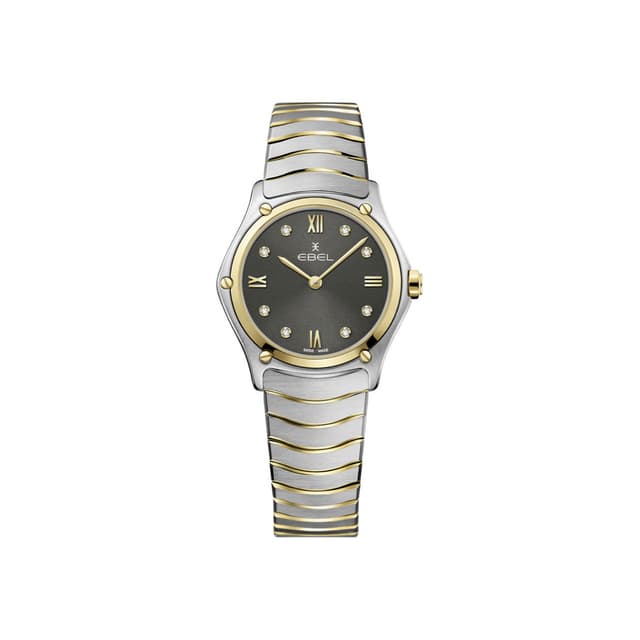 Naisten ebel sport classic lady, ruostumaton teräs ja 18 k keltainen kullakotelo, ø 29,0 mm, antrasiittinen galvaaninen valintakiekko, jossa on käytettyjä roomalaisia numeroita ja 8 timanttia (0,052 ct), safiirikristallia, jossa on anti-reflektiivinen hoito, kaksisävyinen ruostumatonta terästä olevan aaltolinkkiranneke solki.