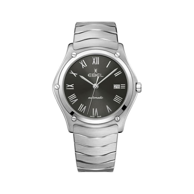 Miesten ebel sport classic -kello, ruostumaton teräskotelo, ø 40,0 mm, antrasiittinen galvaaninen valintakiekko, jossa on käytetty roomalaisia numeroita, safiirikristalli, jossa on anti-peilikäsittely, ruostumattomasta teräksestä valmistettu aaltosilmukka, jossa lukko, sveitsiläinen automaattinen liike, vedenpitävä jopa 50 metriä.