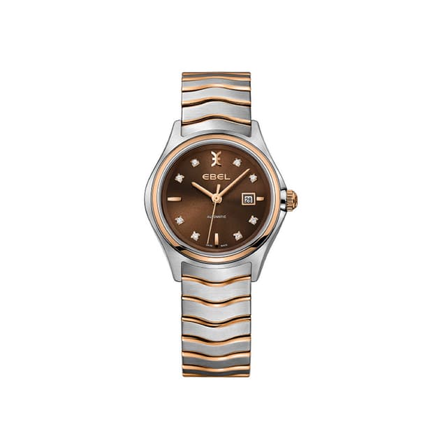 Naisten ebel wave lady -automaattinen kello, jossa on 38 tunnin varaus, 30,0 mm ruostumattomasta teräksestä valmistettu kotelo 18 k punaisella kultaisella kehyksellä ja kruunulla, ruskea galvaaninen soittimella, jossa on 8 timanttimerkkia (0,052 tcw), ebel-symboli ja indeksejä ja päivämääränäyttö, harjattu ja kiillotettu kaksivärinen ruostumattomasta teräksestä valmistettu allekirjoitus aalto-linkki rannekoru käyttöönotto lukko.