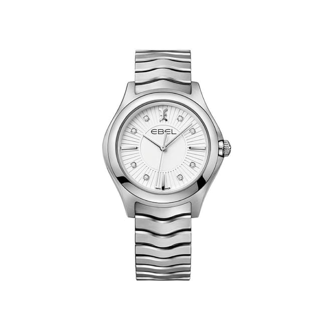Naisten ebel wave grande-kello, 35,0 mm harjattu ja kiillotettu ruostumaton teräskotelo, hopea galvaaninen 8-timanttimarkkeri (0,052 t.c.w.) ja käytetty ebel-symboli ja indeksit, harjattu ja kiillotettu ruostumattomasta teräksestä valmistettu allekirjoitus aaltorenkaan rannekoru.