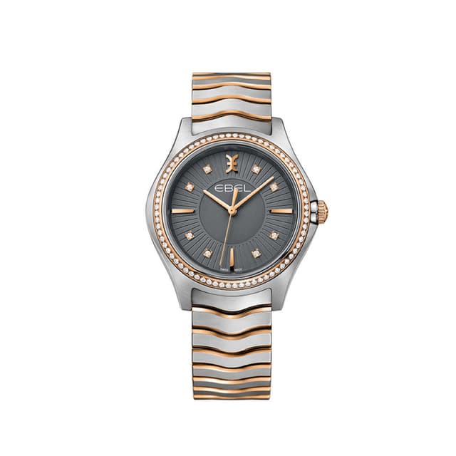 Naisten ebel wave grande -runko, 35 mm: n ruostumaton teräskotelo, jossa on 72-timantti 18 k keltainen kultainen kehys ja 18 k kultainen kruunu, harmaa galvaaninen soittimella 8 timanttimerkkiä ja käytetty ebel-tunnus ja indeksit (0,520 tcw timanttia), harjattu ja kiillotettu kaksi- värillinen ruostumaton teräs allekirjoitus aalto-linkki rannekoru käyttöönotto lukko.