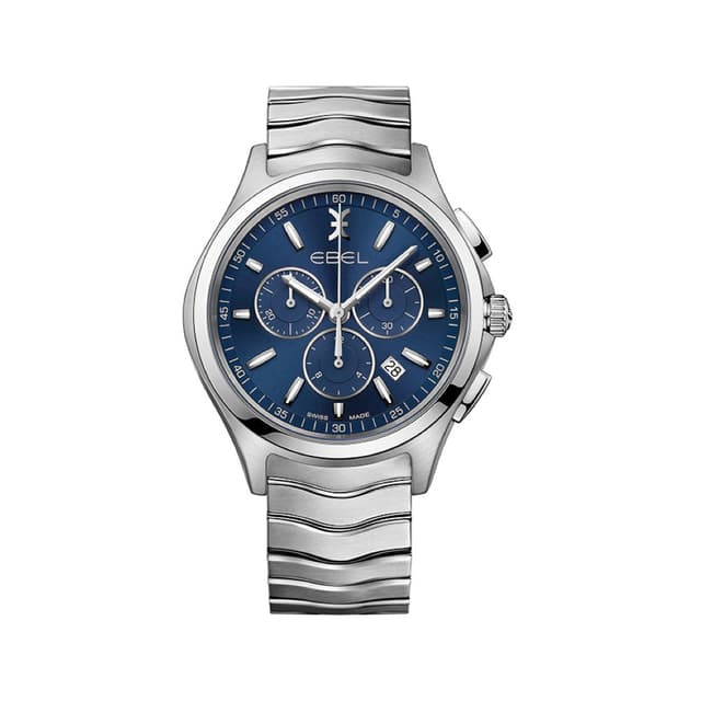 Miesten ebel wave -kronografi, 42,0 mm harjattu ja kiillotettu ruostumattomasta teräksestä valmistettu kotelo, sininen galvaaninen kiekko, jossa on vastaavat alikuvakkeet ja arabialainen heijastinpaneeli, hopeanvärinen ebel-symboli ja indeksit, luminoiva yksityiskohdat ja päivämääränäyttö, harjattu ja kiillotettu ruostumattomasta teräksestä valmistettu aaltorullaketju käyttöönottoketjulla.